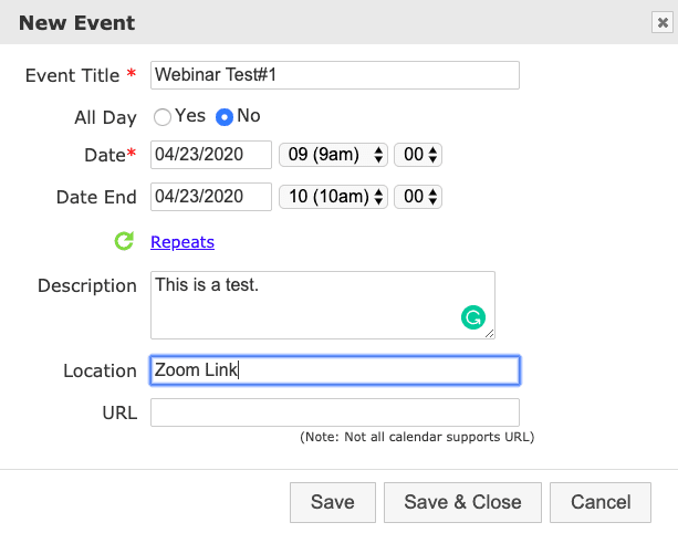 - Enter the event details; Event Title, Date/Time, Description and Location.