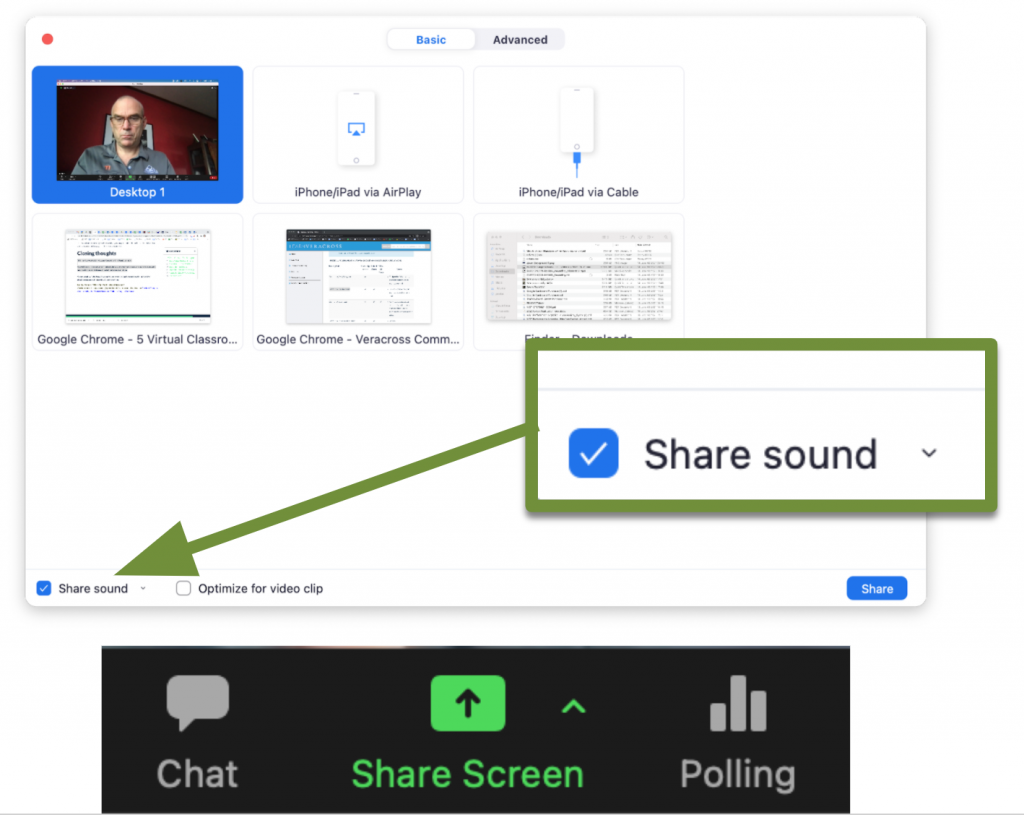 - Share Screen or Share Content – You (or your students) can share your whole Desktop or just a certain application or Chrome window into the Zoom meeting. If sharing video, be sure to “Share Sound.”