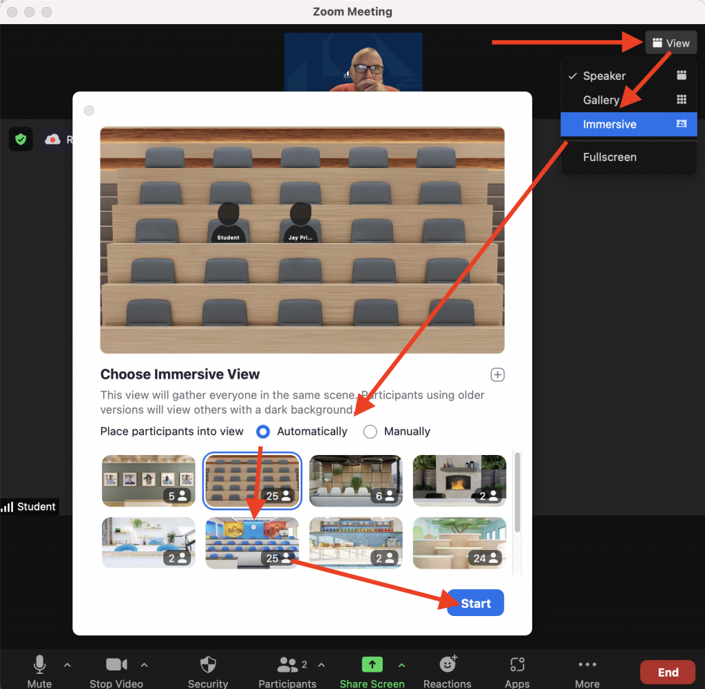 - Meeting hosts (only) can select Zoom’s Immersive View. When enabling Immersive View, hosts will have the option to automatically or manually place participants into a virtual scene of their choosing. Hosts can also easily move participants around that scene and even resize a participant’s image for a more natural experience.