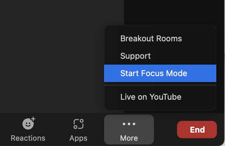 - Start Focus Mode (and Stop Focus Mode) can be found in the “More” menu in the in-meeting toolbar (bottom of Zoom app).
