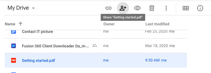 - Find the file in your Drive. Then click to select the uploaded file then click the share icon in the top menu.