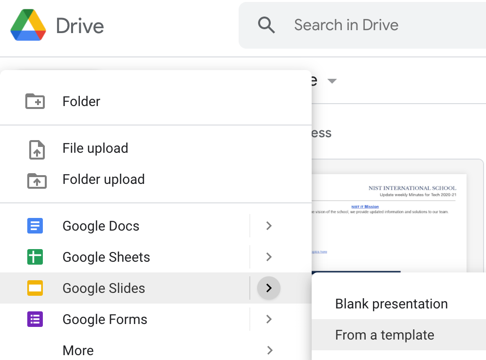 • In Drive, click on the +New button to reveal the submenu, then for your chosen document type, hover on the > arrow to reveal the option to create new From a template.
