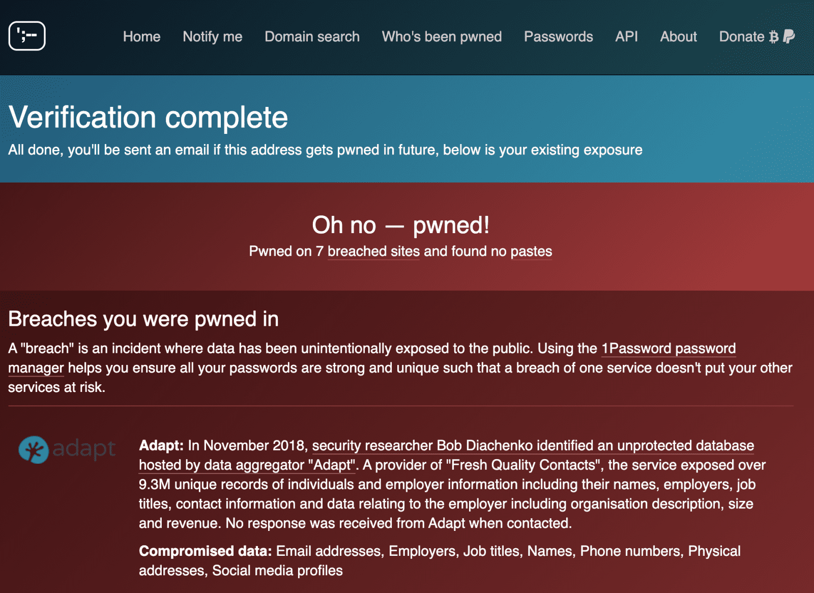 - “Verification is complete” message will show. Get your results displayed and be informed of any new pwnage in the future.