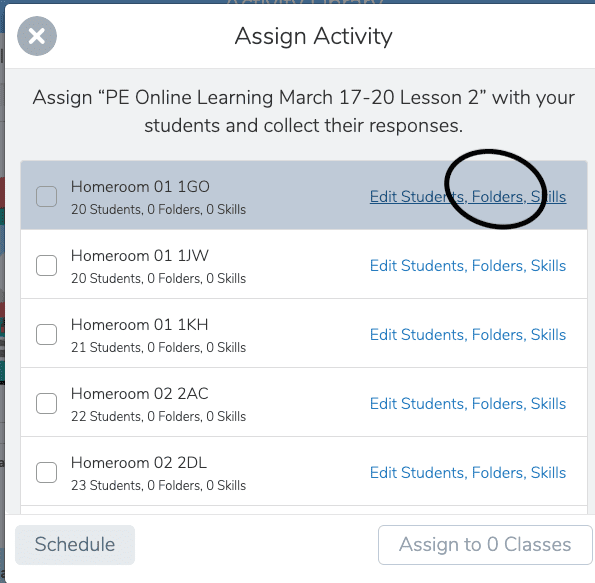 - Assigning to folders is possible. When assigning activities to several classes, click the folders tab and then select folder you want the activity to go in for each class.