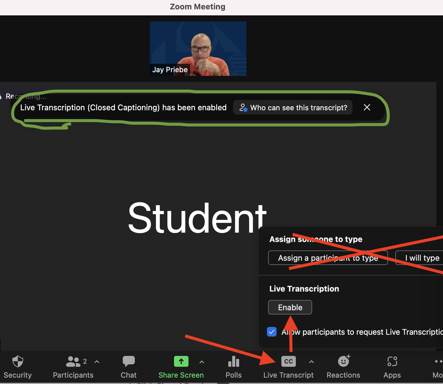 - Click CC Live Transcript button then Enable. Participants will see a pop-up message that Live Transcription has been enabled.