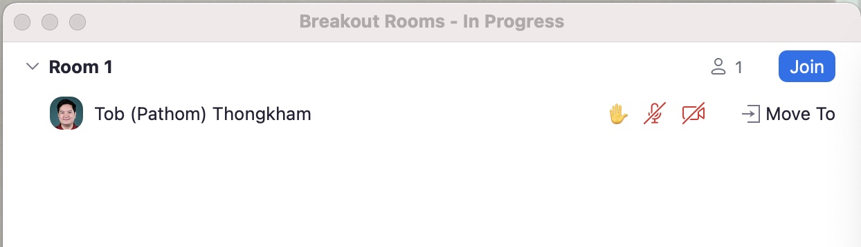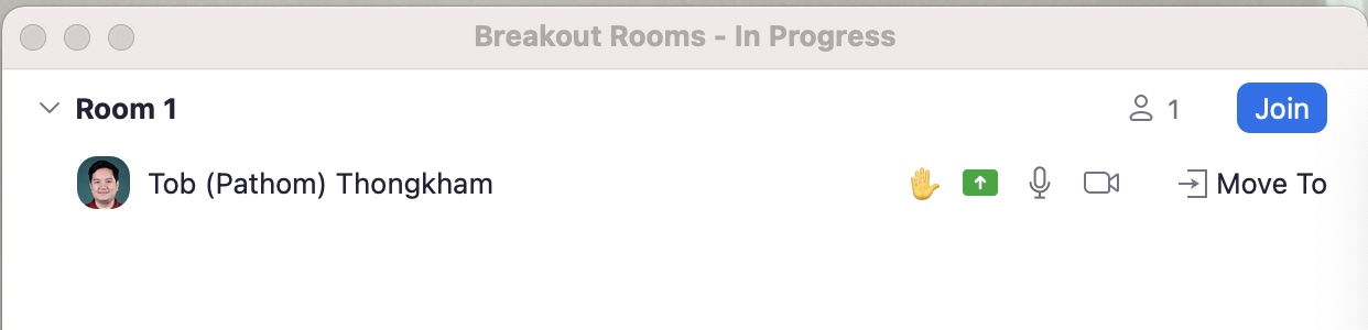 - Participants show up (to the host only) as follows in Breakout pop-up.